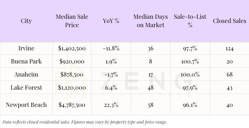 The data shown here reflects closed sales, not asking prices or headlines. It is intended to offer context—how pricing, timing, and buyer behavior are evolving across different parts of Orange County—rather than predictions about where the market “should” go next.